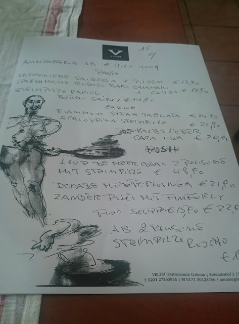 Keskustassa yksi lemppariravintoloistamme on pikkuinen Veltri, jossa italialaispadrone keittelee hyviä ruokia ja vaimo hoitaa tarjoilun. Veltri on vähän piilossa Kolumba-museon vieressä ja heillä on myös muutama pöytä ulkona.