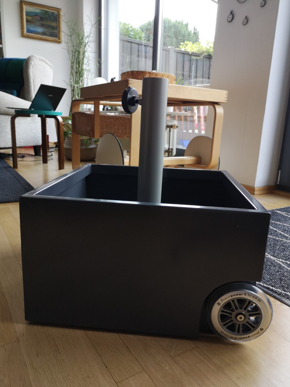 Design-juttuja myyvä firma tarjosi alennusta puutarhakamoista ja lähetyksen ilman postikuluja. Kun me tämän karmean kuuman kesän aikana pompimme pihassa edestakaisin markiisin ja auringonvarjon alle ja silti oli varjottomia paikkoja, päätimme ottaa ensi kesänä toisenkin varjon käyttöön. Varjo on meillä jo, mutta siitä puuttuu jalka, sellainen jalka, jota on helppo siirtää paikasta toiseen. Sellainen löytyi ystäväni Erikan avulla, jalka, johon voi istuttaa kasveja, wow, voin kuvitella miten kiva siitä tulee ensi kesänä.